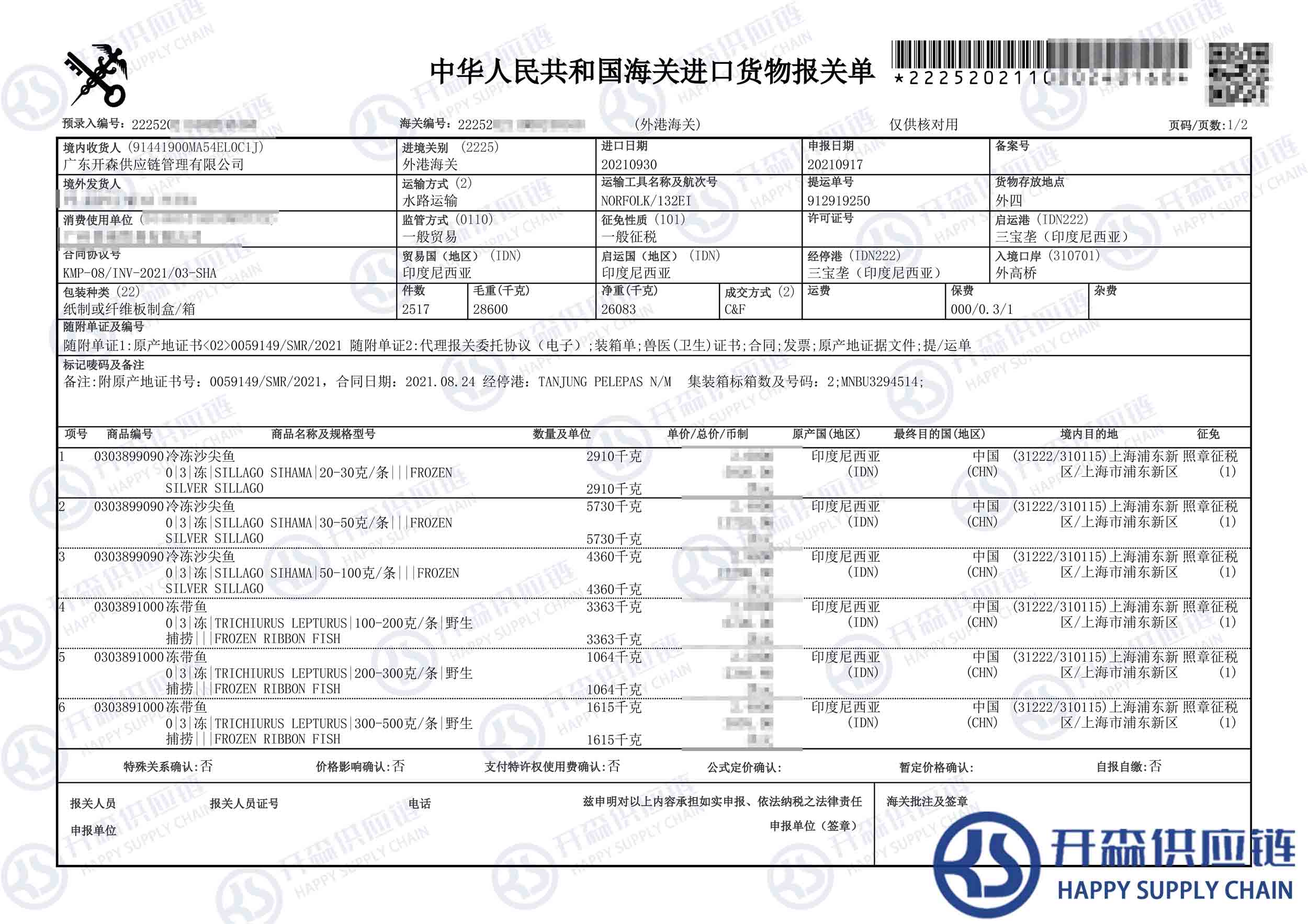 【本文結(jié)語】 上述就是印尼凍帶魚進(jìn)口報(bào)關(guān)清關(guān)代理案例【經(jīng)典案例】的全部內(nèi)容,希望能對您有所幫助,如有冷凍海鮮進(jìn)口報(bào)關(guān)上任何疑問及問題可隨時(shí)在線聯(lián)系我們或撥打 18002611553,開森供應(yīng)鏈擁有豐富的冷凍海鮮進(jìn)口報(bào)關(guān)操作經(jīng)驗(yàn)及案例,10余年進(jìn)口經(jīng)驗(yàn)為您所用,各類進(jìn)口疑難都能為您一一解答及協(xié)助快速處理解決!