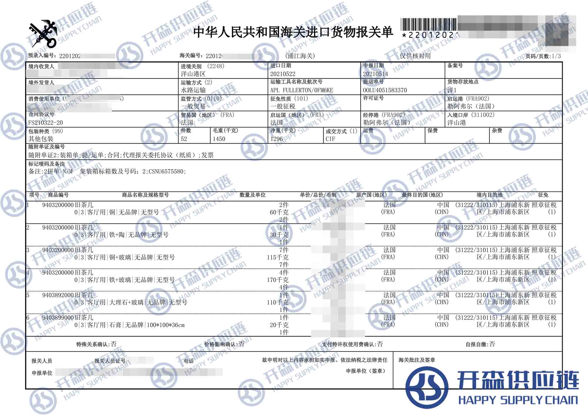 一、法國二手舊茶幾家具進(jìn)口報關(guān)代理案例詳情