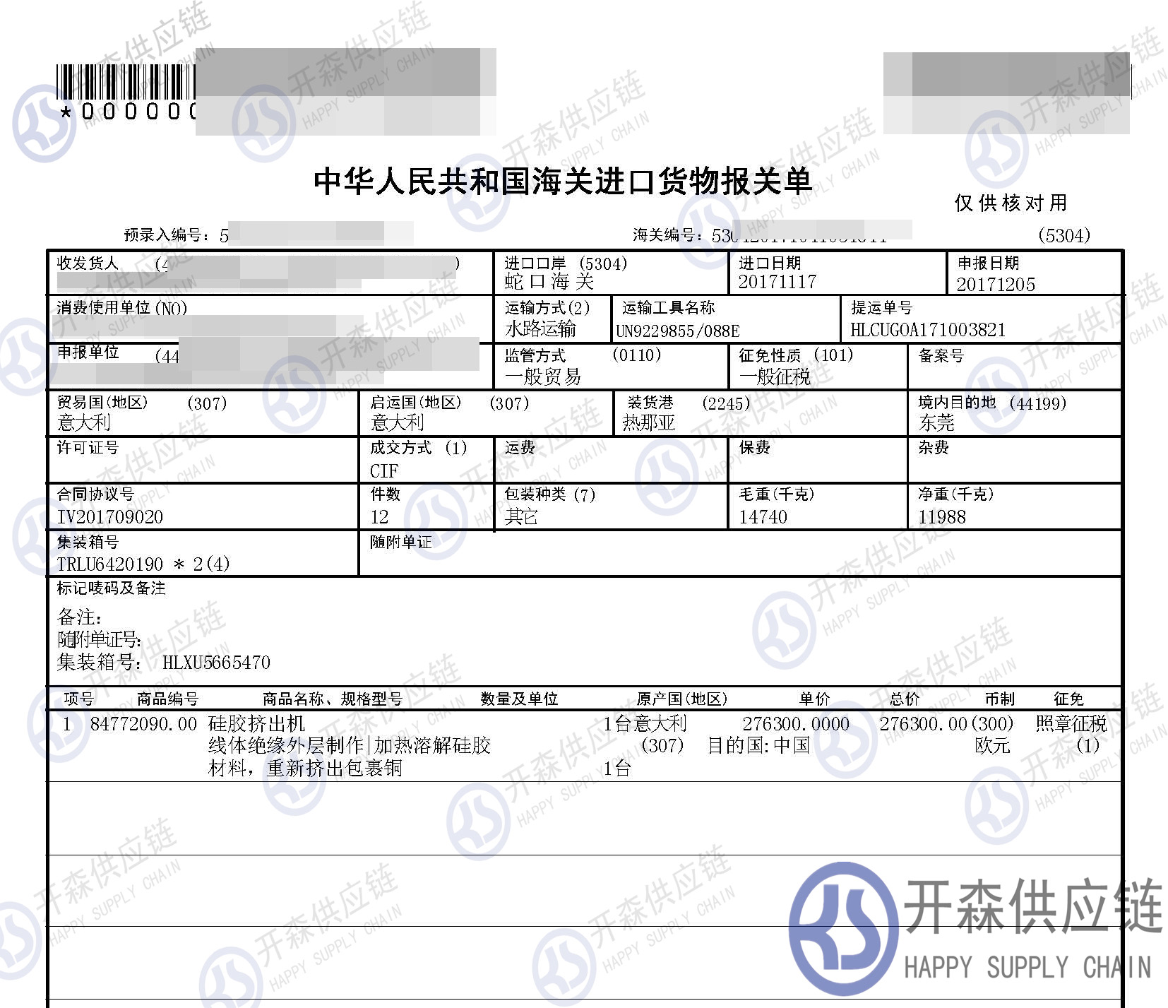 從意大利進口一臺硅膠擠出機到深圳蛇口碼頭,我司提供門到門機械設備進口一站式清關服務,開森擁有十余年二手機械設備進口清關經(jīng)驗及案例,為客戶提供量身制作的進口方案,讓客戶進口省時省心省成本。
