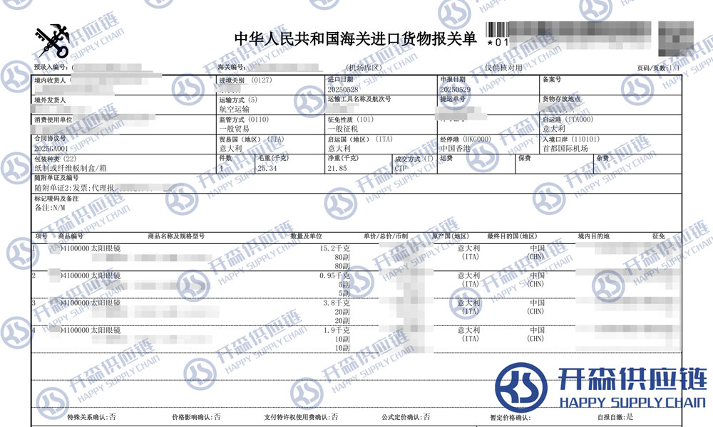 【本文結語】 上述就是北京機場太陽眼鏡進口報關代理服務【清關案例】的全部內容,希望能對您有所幫助,如有進口報關,進口報關代理公司,進口報關代理上任何疑問及問題可隨時在線聯系我們或撥打 18002611553,開森供應鏈擁有豐富的進口報關,進口報關代理公司,進口報關代理操作經驗及案例,10余年進口經驗為您所用,各類進口疑難都能為您一一解答及協助快速處理解決!