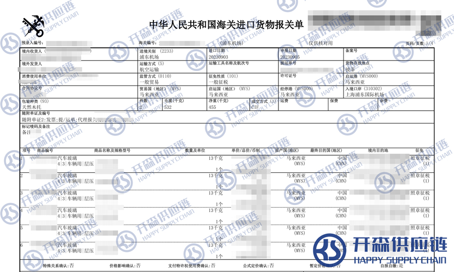 【本文結語】 上述就是上海機場馬來西亞汽車玻璃進口報關代理服務【清關案例】的全部內容,希望能對您有所幫助,如有汽車配件進口報關上任何疑問及問題可隨時在線聯系我們或撥打 18002611553,開森供應鏈擁有豐富的汽車配件進口報關操作經驗及案例,10余年進口經驗為您所用,各類進口疑難都能為您一一解答及協助快速處理解決!
